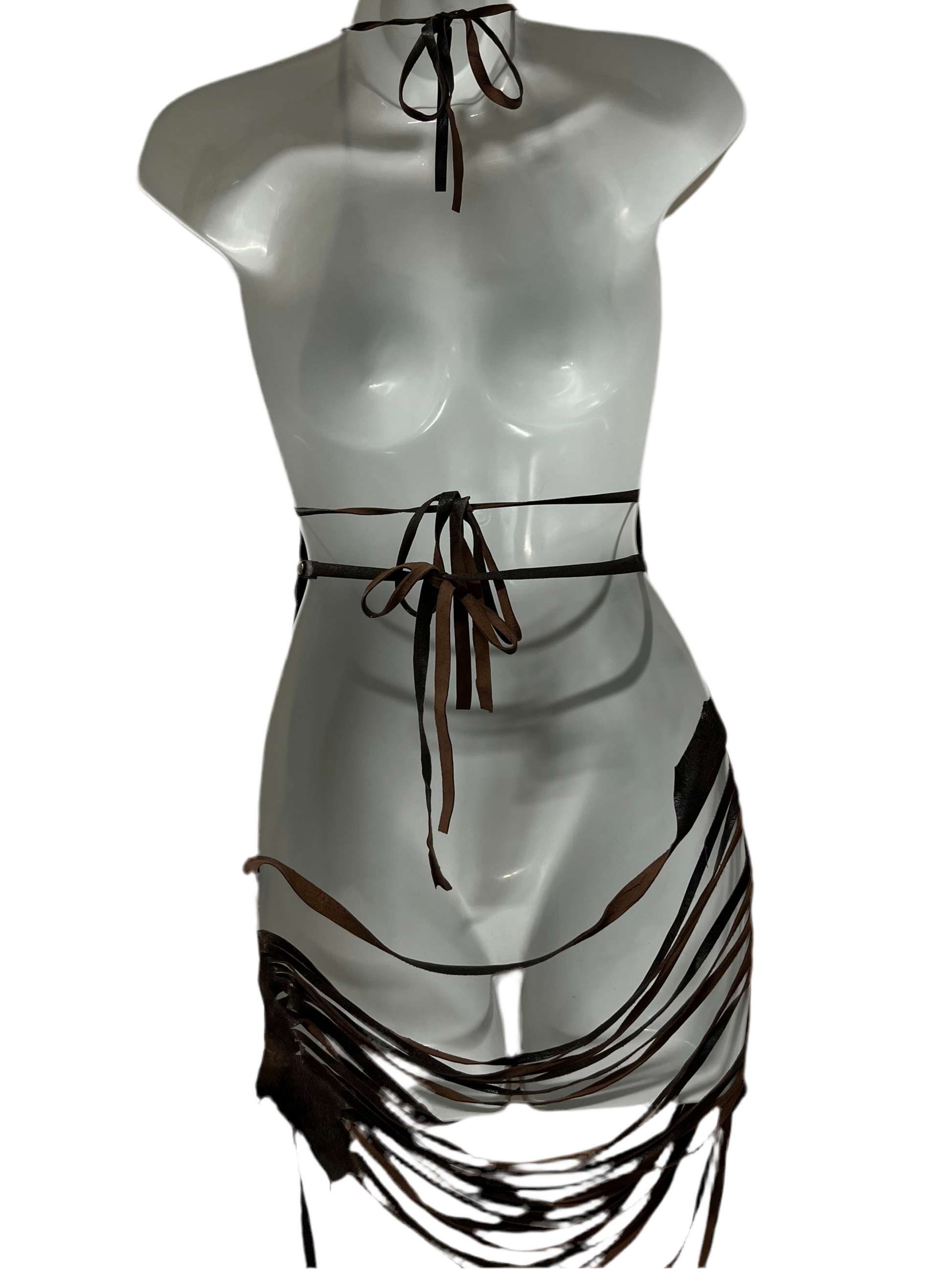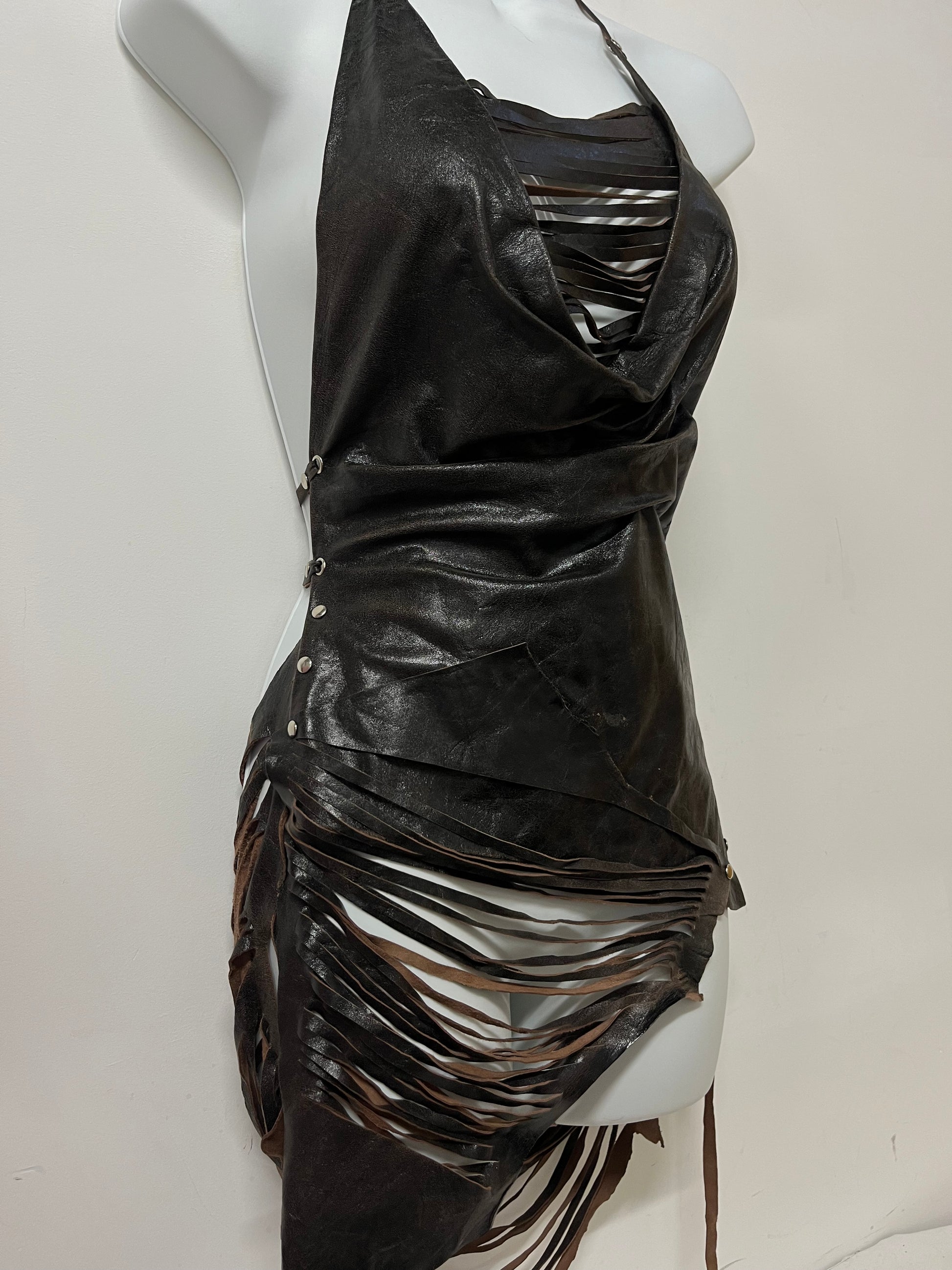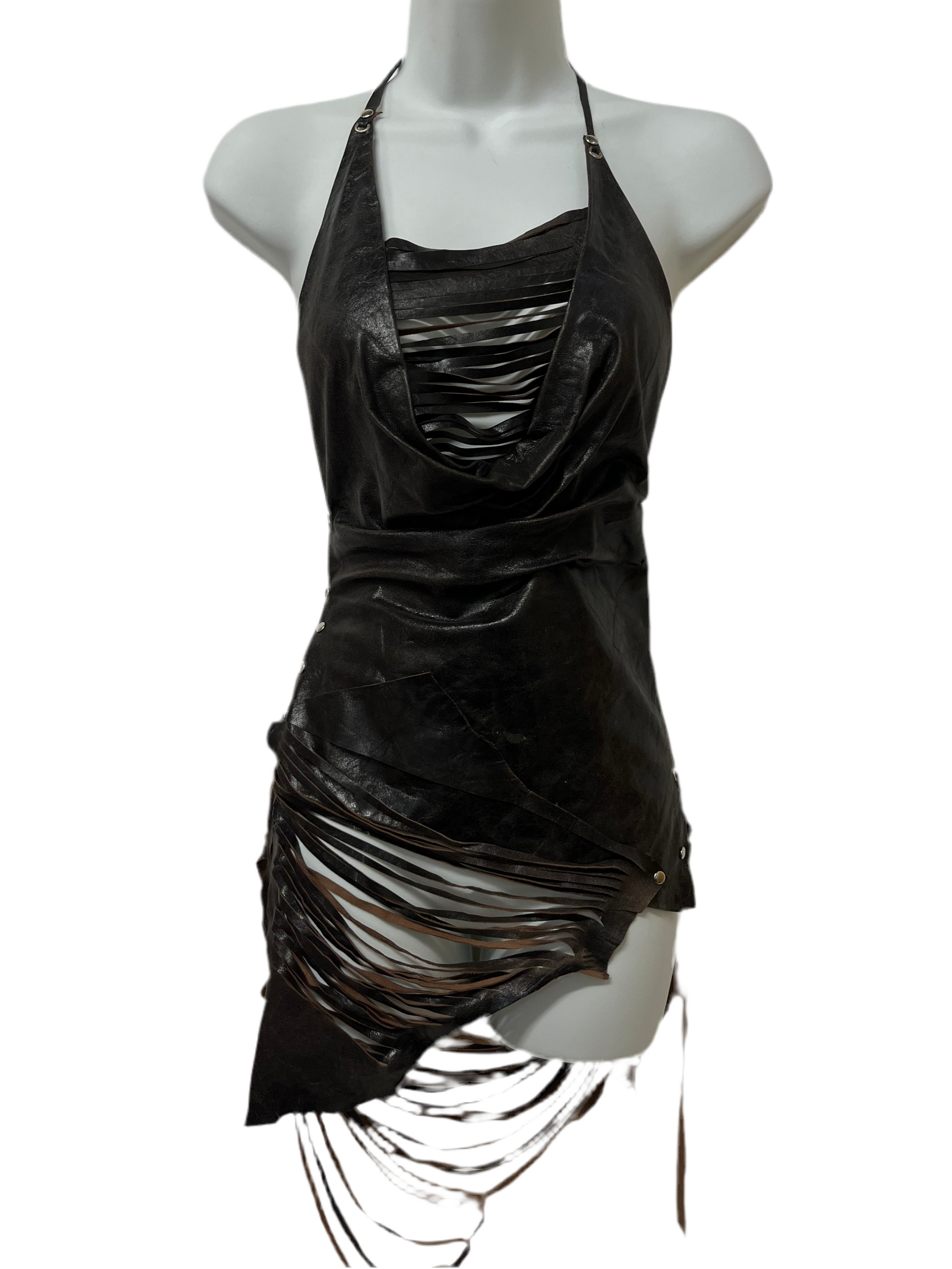 Leather cowl neck with slitting detail on chest and around hips & back. Adjustable neck and back (halter style)