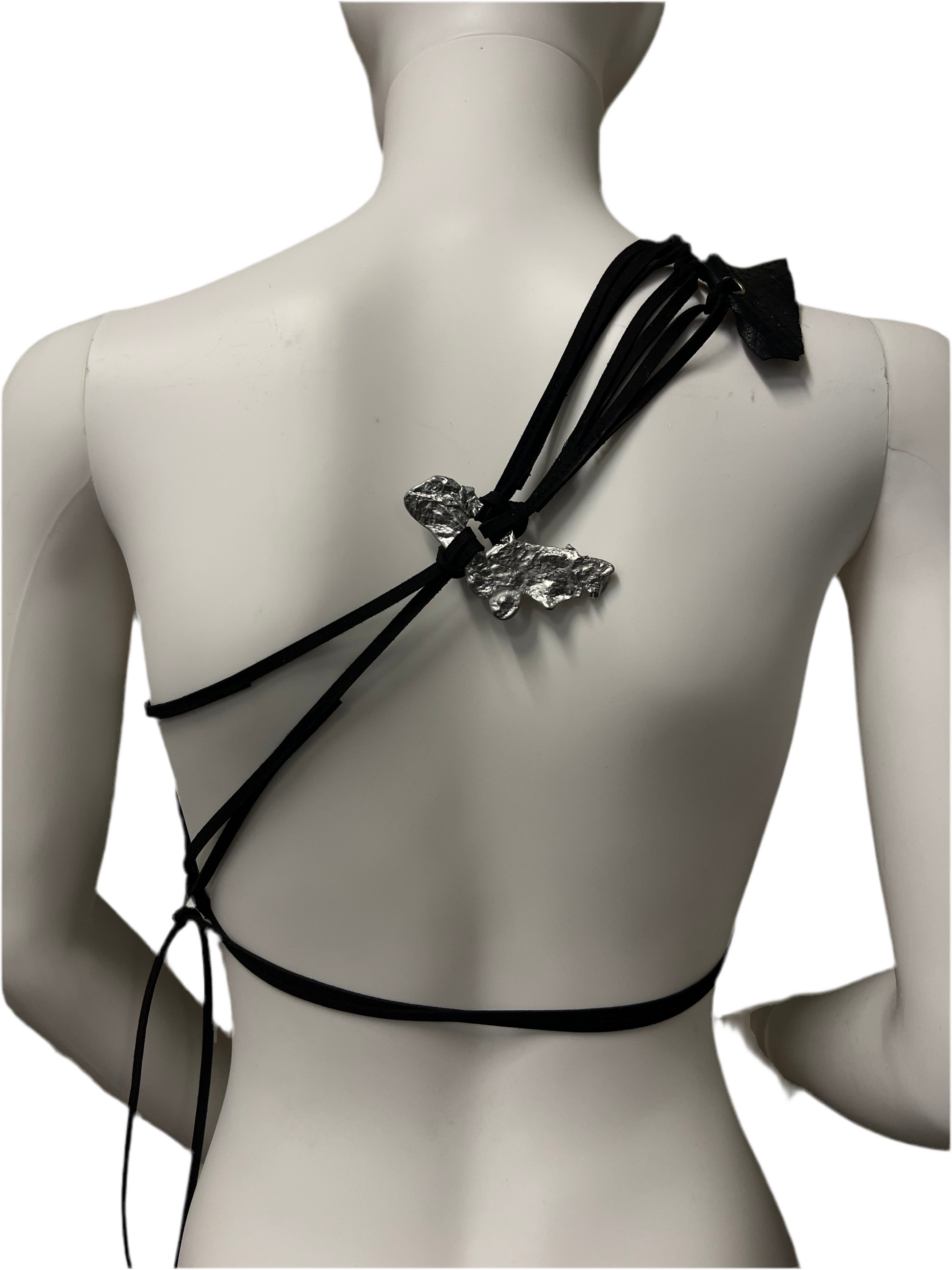 GENUINE TEXTURED LEATHER DRAPED TOP WITH HANDMADE PEWTER PENDANT DETAIL AT THE BACK