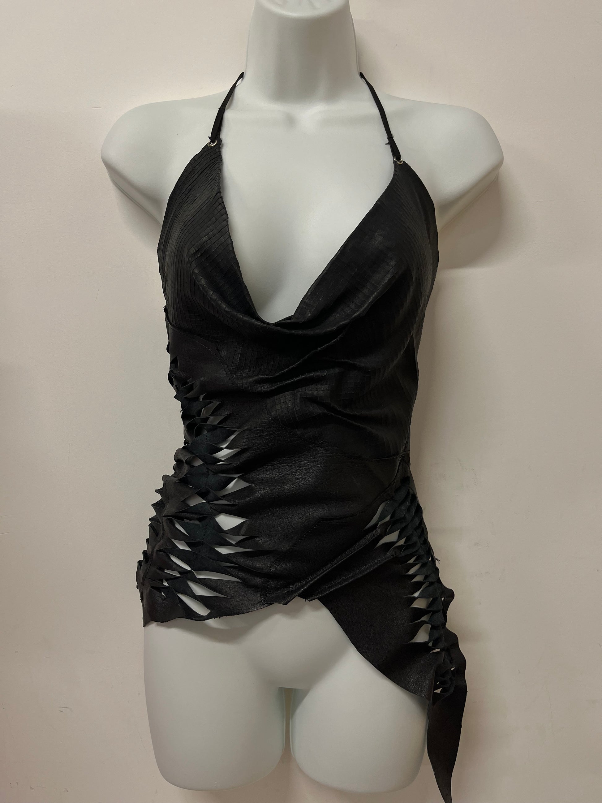 Leather draped cowl neck made from leather offcuts, with slitting / weaved detail mimicking fish scaling. Backless with adjustable neck and back.