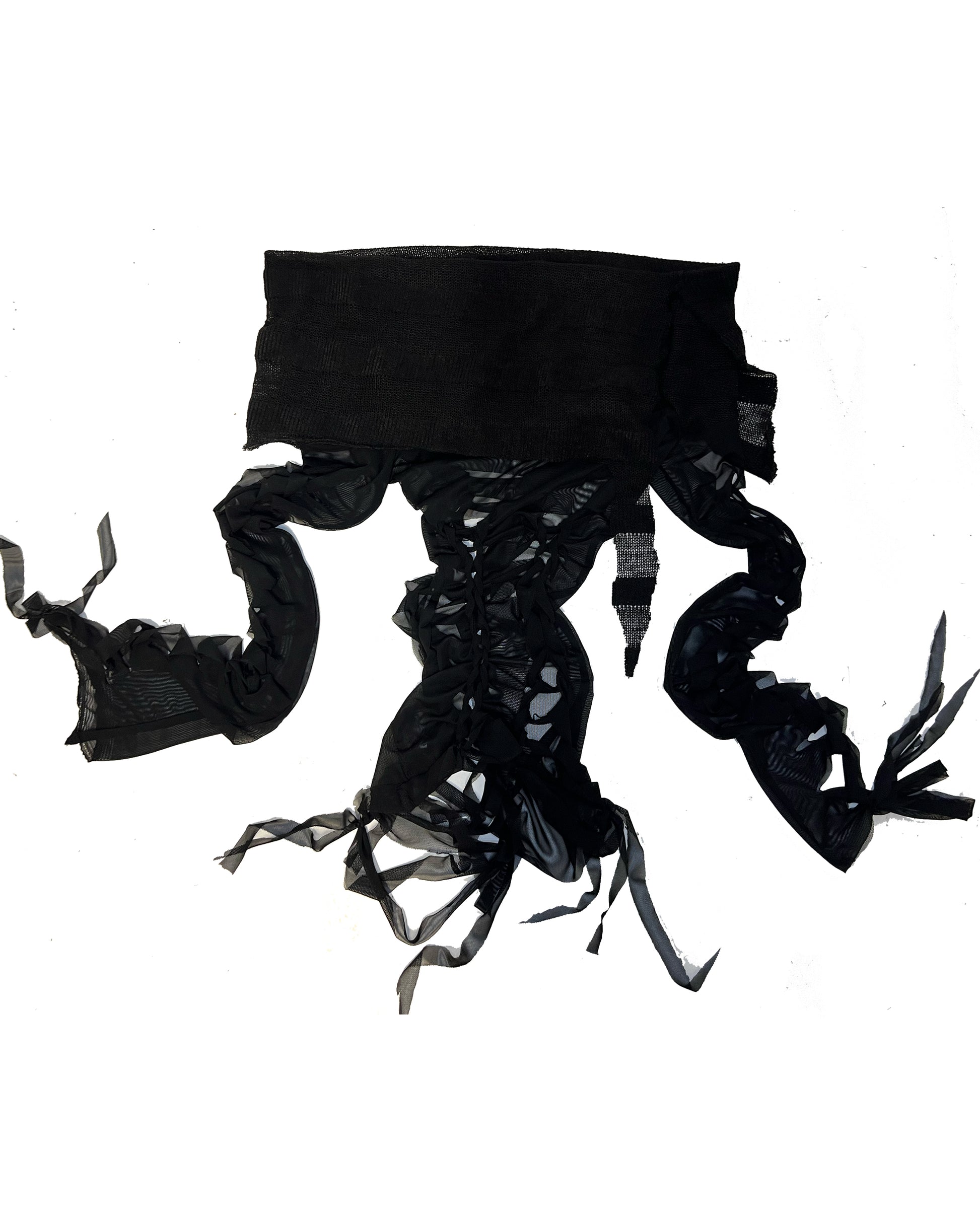 Mesh weaved with a knitted off-shoulder neckline. Cutest winter staple!